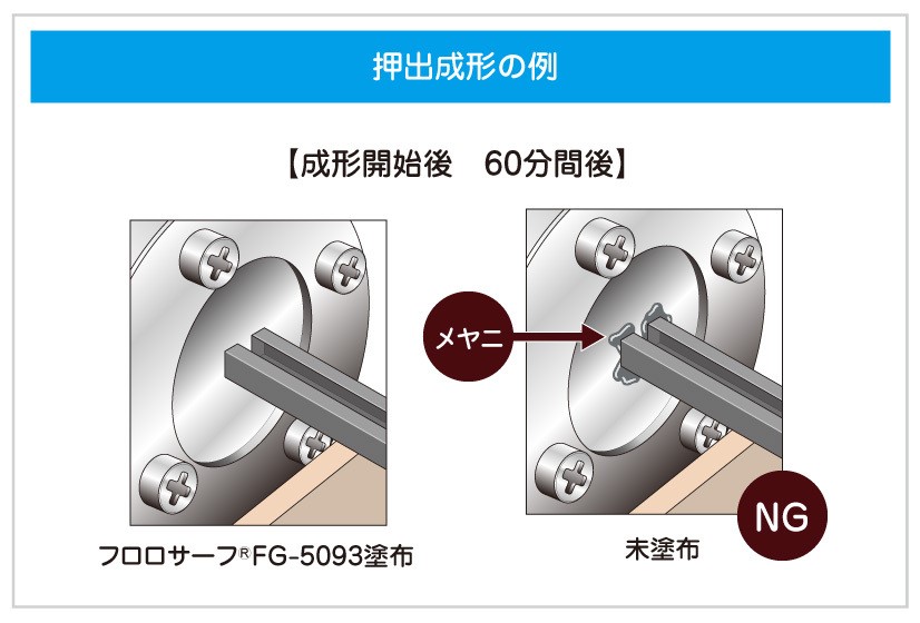 압출 성형의 입금에 도포해 두면 메야니가 적어집니다. 도포 부분에 밀착한 이형막에 의해 , 연속적으로 이형성이 발휘되기 때문에, 메이어니가 생기기 어렵고, 장시간의 연속 성형을 발휘할 수 있습니다.